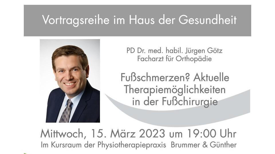 Die Vortragsreihe von MedArtes im Haus der Gesundheit Neutraubling fand in Kooperation mit Physiotherapie Brummer & Günther statt, um die Öffentlichkeit über verschiedene Gesundheitsthemen zu informieren . Ein Beispiel ist der Vortrag von DProf. Dr. med. habil. Jürgen Götz, MHB am 15. März 2023 über "Fußschmerzen? Aktuelle Therapiemöglichkeiten in der Fußchirurgie". Die Reihe bietet die Möglichkeit, sich zu informieren und Fragen zu stellen, um ein besseres Verständnis für aktuelle Therapieansätze zu gewinnen.